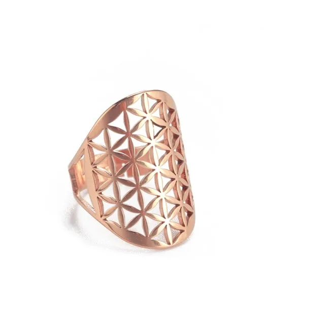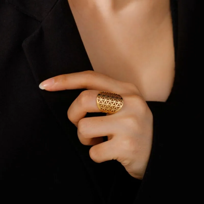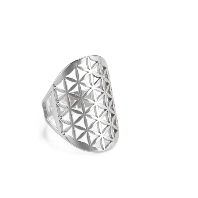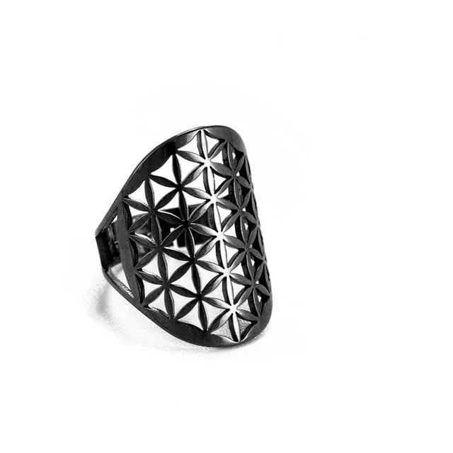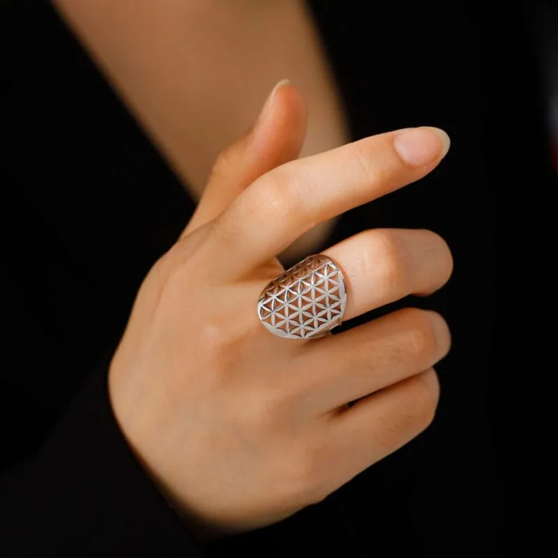 Plongez dans l’univers sacré de la géométrie sacrée avec notre bague Fleur de vie ajustable en acier inoxydable !