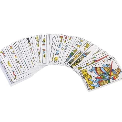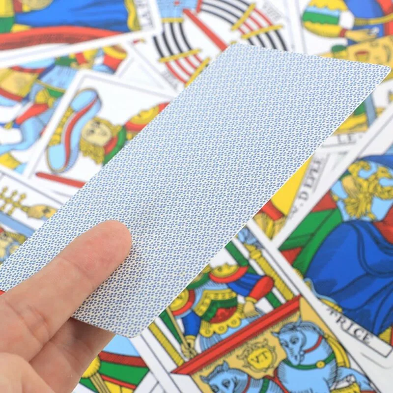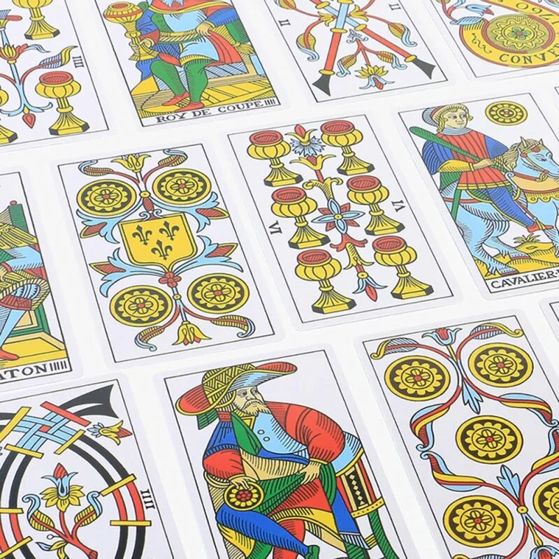 Les cartes sont imprimées sur papier cartonné de haute qualité, avec une finition mate, et présentent des couleurs vives et des symboles précis. Les cartes sont légères et résistantes, avec des bords lisses et arrondis. Chaque carte mesure 12 x 7 cm et est imprimée avec des inscriptions en vieux français (ex: Roy d’épée, Reyne de Baston….etc.).