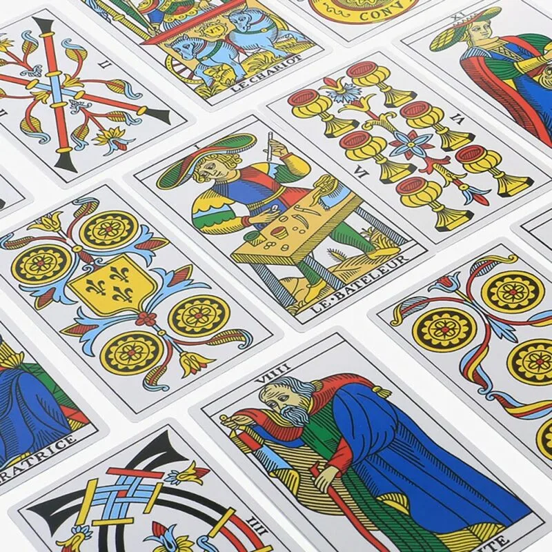 Selon les recherches historiques actuelles, les cartes de tarot sont nées dans le nord de l’Italie aux alentours du 14e siècle. Aux XVIIème et XVIIIème siècles, les fabricants de cartes en France, et en particulier dans la ville de Marseille, ont adopté un modèle commun pour les cartes de Tarot. Ce modèle, qui a évolué directement à partir des premiers jeux de Tarot, est devenu la norme du Tarot traditionnel. Largement connu sous le nom de « Tarot de Marseille », il a servi de base aux interprétations mystiques des symboles du Tarot, et d’inspiration originale pour les nouveaux jeux qui sont devenus populaires au cours du XXe siècle.